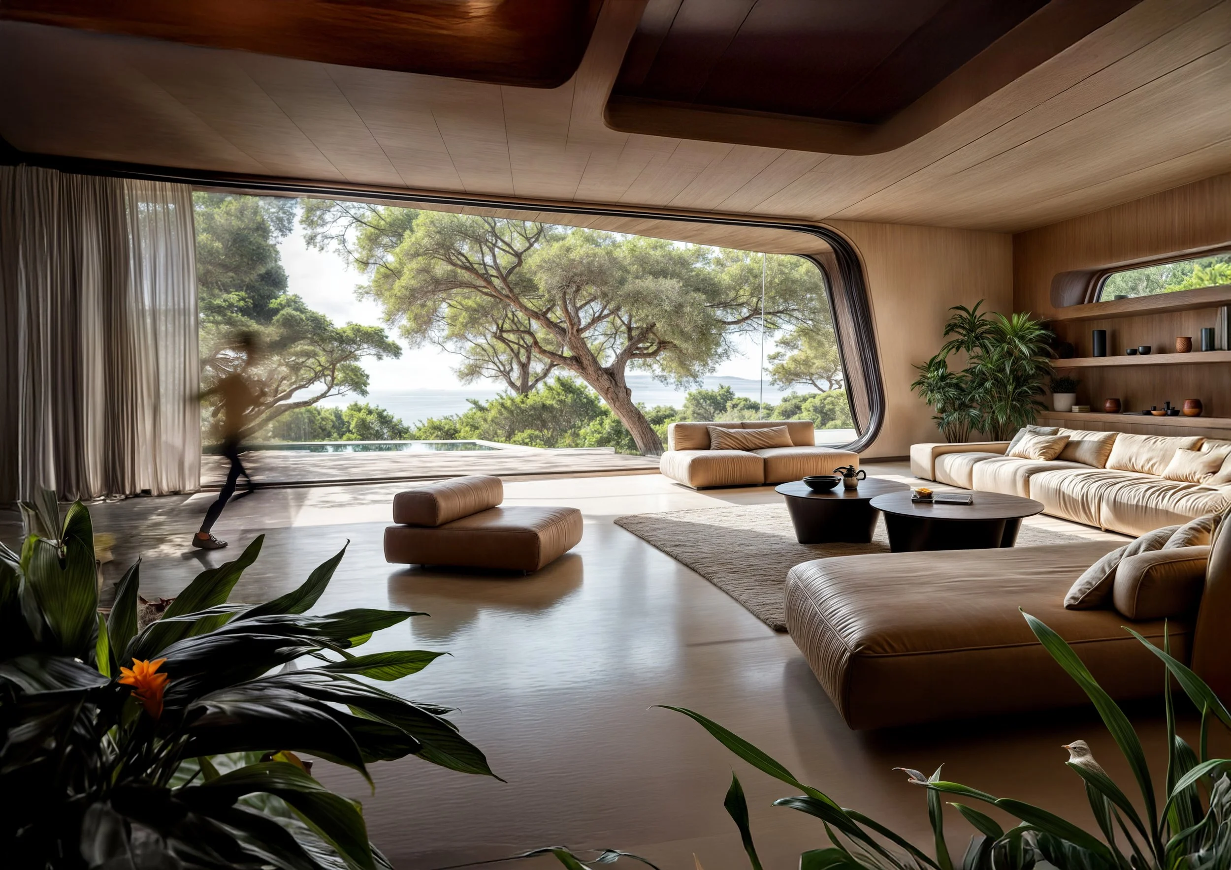 Bedrooms and more private functions are subtly tucked away or divided through non-invasive spatial strategies — changes in floor height, slight shifts in orientation, or concealed partitions. The result is a home that feels open but never exposed.